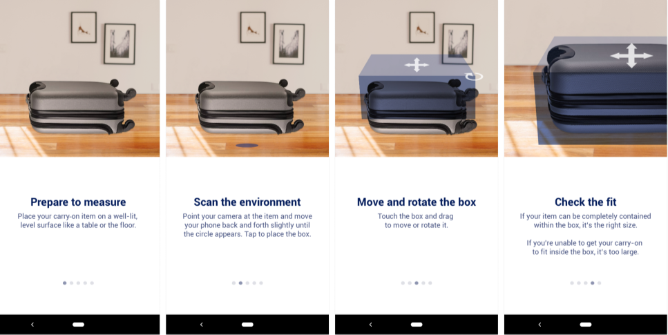 Travelocity was developing a native Augmented Reality (AR) app to help travelers ensure their carry-on bags met the airline's size criteria.I worked with design and engineering partners to quickly, clearly, and accurately describe motion and physical space in a 5-screen onboarding flow.