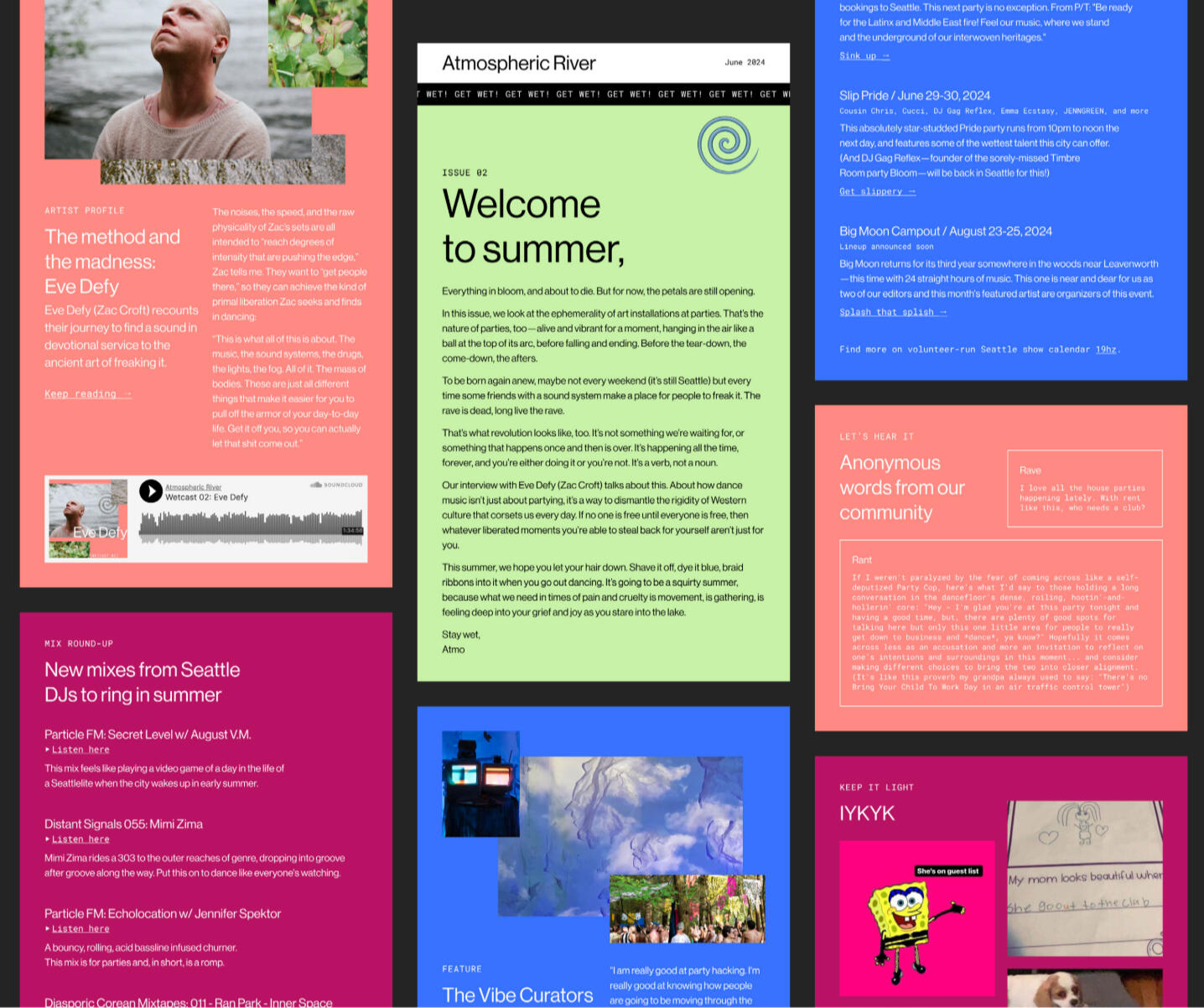 I’m a founding co-editor of the email newsletter Atmospheric River about underground electronic music in Seattle (along with Kelsea Dill and Hans Anderson).Each issue contains features, profiles, album reviews, DJ mixes, upcoming events, community submissions, memes, and more.I write the artist interview series, “The method and the madness.”
